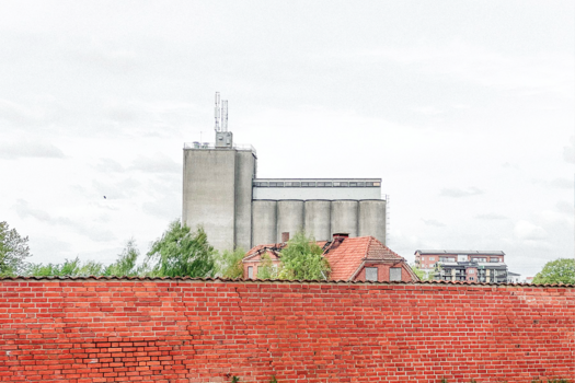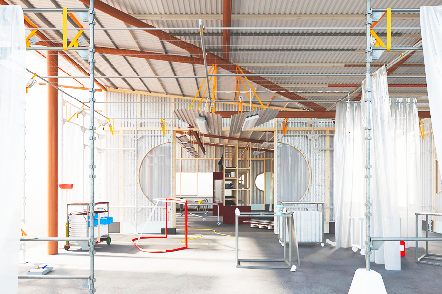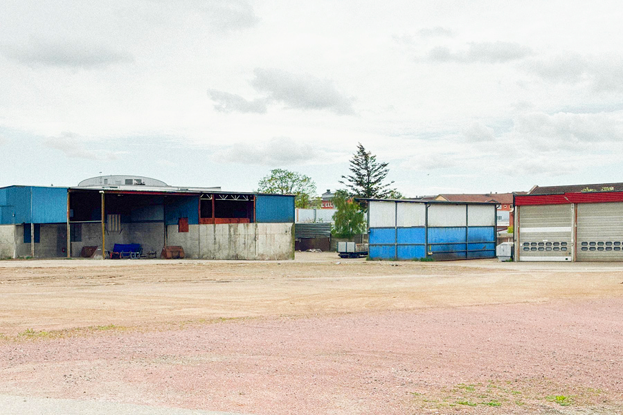 We demonstrate a design approach that values existing structures and land for its history, materials, and spatial relationships. Industrial halls become spaces for work, prototyping, and later material depots and green courtyards supporting biodiversity. To address the unpredictable outcomes of reuse and bio-materials, we apply strategies like infills with local biomaterials between solid, reused gables and walls.