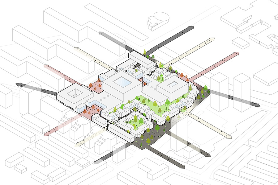 By splitting the complex into smaller parts and restoring a fine-grained urban fabric, the project allows a flexible and phased transformation. Elements of the theatre can remain in use until relocation, while new actors can join the process step by step as individual buildings are redeveloped. Greiner’s modular grid supports this negotiated approach, enabling adaptation over time and accommodating changing needs throughout the implementation.
