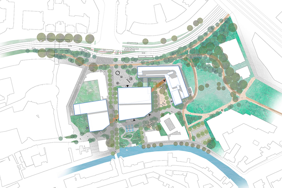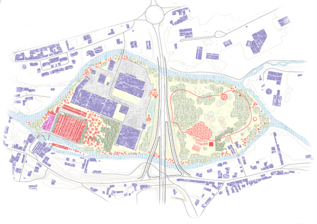 With all layers of time intersecting in the same place, re-sourcing here means listening to the land, to old infrastructures, to forgotten paths, and allowing them to guide a renewed cultural life where past, present, and future speak at once. The project restores water, soil, and vegetation, creates open cultural spaces for collective use, and reuses materials through low-impact construction, transforming a car-dominated site into a porous, resilient public realm.