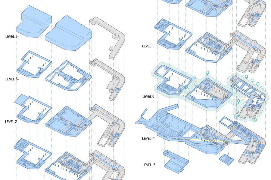 The site’s shift from a mixed urban fabric to a cultural district creates friction in logistics, scale, and historical continuity due to the presence of several protected buildings. Our response rethinks neighborhood flows, fragments the program into three buildings linked by an underground inner street, and applies differentiated strategies toward the existing: inside, around, or instead of.
