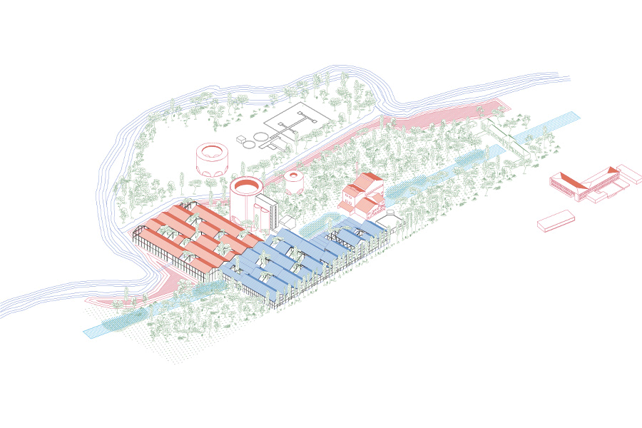 The project redefines the site’s relationship with its territory through a careful and iterative process that interweaves social initiatives, low-tech industries, and artisanal production. By activating the site’s material, energetic, and social resources, Entre-Lacs becomes a renewed source of value for the entire bioregion. This transformation supports ecological evolution through frugal remediation, circular material flows, and nature-led regeneration, while fostering social evolution by empowering local actors, establishing shared governance, and rebuilding productive solidarities. In this sense, the project is regenerative: it does not merely repair a place, but generates new ecological and social capacities that continue to grow over time. We define Re-sourcing as the activation of the site’s natural, social, and material resources to regenerate its relationship with the wider territory. Structured around three pillars (matter, energy, and life) the project forms an integrated and self-sustaining ecosystem, resilient both ecologically and socially.