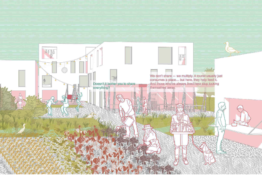 "The project addresses Re-sourcing by reactivating Polignano a Mare’s latent ecological, social and agricultural resources, reconnecting the hinterland to the coast. Nature becomes living infrastructure, sociality is re-sourced through co-design and communitarian spaces, and regeneration emerges from restoring biodiversity, shared living and circular local economies rather than extractive tourism."