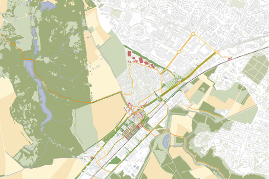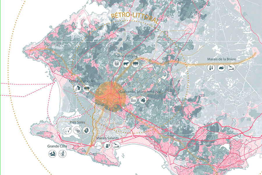 "The project-process proposes an analysis of the slow evolution of the soil and its anthropised evolution (first natural, then cultivated, exploited, sealed). The project invokes the notion of ‘resourcing’ through natural dynamics such as soil rehydration or the preservation of agricultural land, and by strengthening social ties through the rehabilitation of railway heritage or the networking of public spaces."
