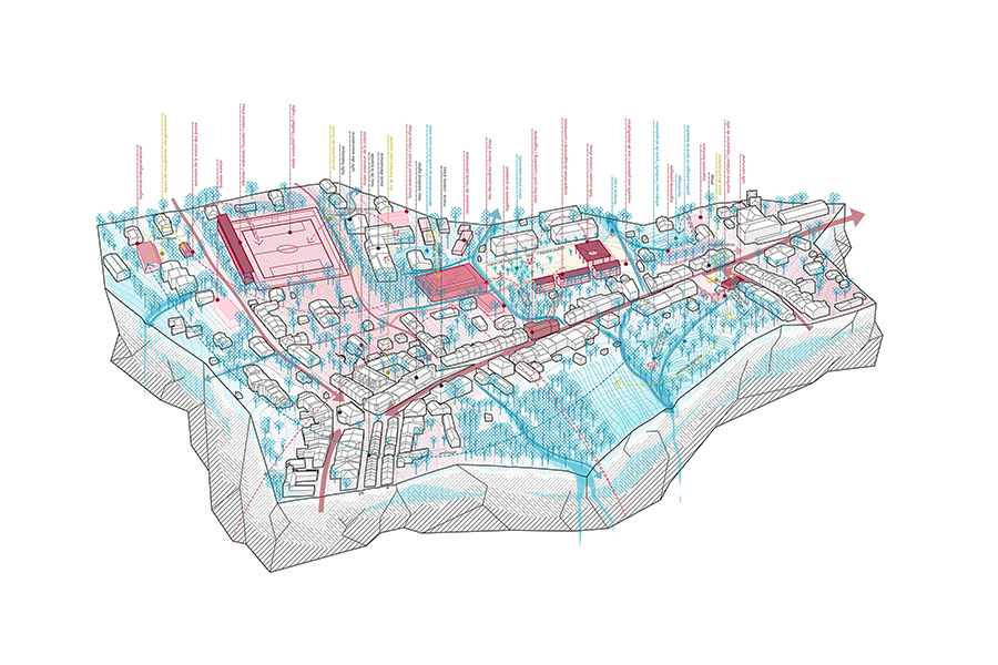 "Re-garde l’eau. reveals the interconnection between nature and the built environment, at every scale, creating a city connected to its territory by water, through housing, facilities, public spaces and the landscape. The project takes advantage of this fractal as a basis for Nailloux: a destination to be lived, a more autonomous city in harmony with the resources offered by its territory."