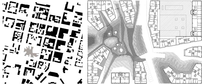 The individual flats in the fragmented building blocks are a contemporary transposition of the 19th-century apartment building, with a longitudinal inner wall and an irregular outer shape defined by the urban morphology.