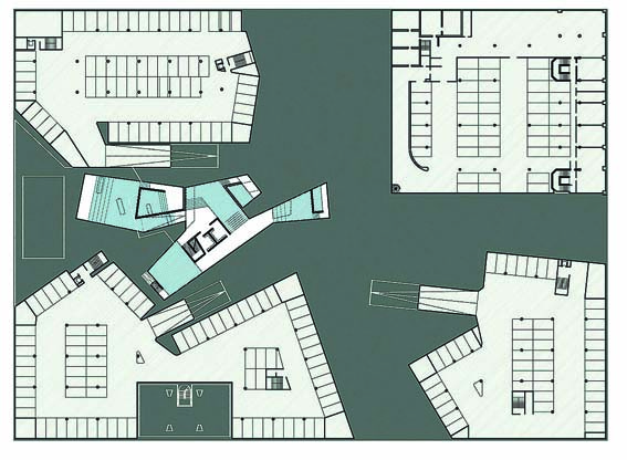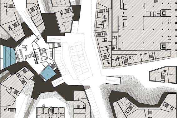 The internal space of the block explodes outwards through a series of finger-like connections between the public inner core, structured as a hidden topographical park, and the public areas outside.