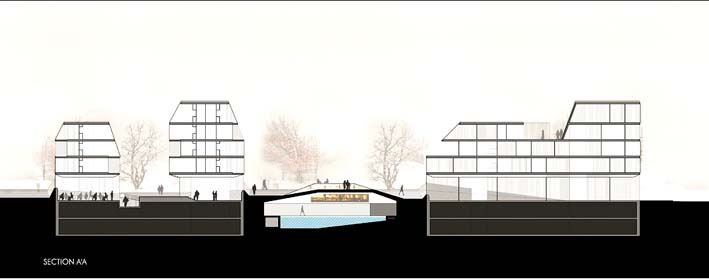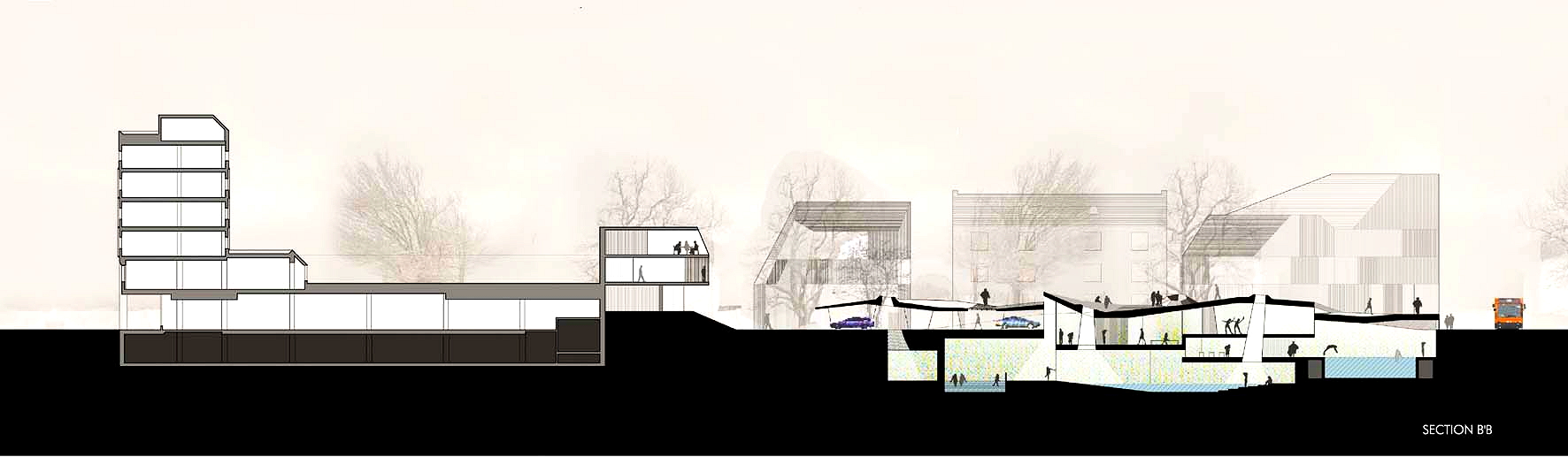 The position of the new buildings comes from a strong desire to define the boundaries of the block, a rectangle of 100x140 metres. In the first phase the two corners on the main boulevard are configured, to be added. The new buildings, along with some of the existing structures, generate both pedestrian and vehicular flows through the block. The formal and visual fluidity of this topographical building invites the public to move through the block, while not disturbing the semiprivate garden function this space provides for the residents.