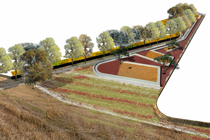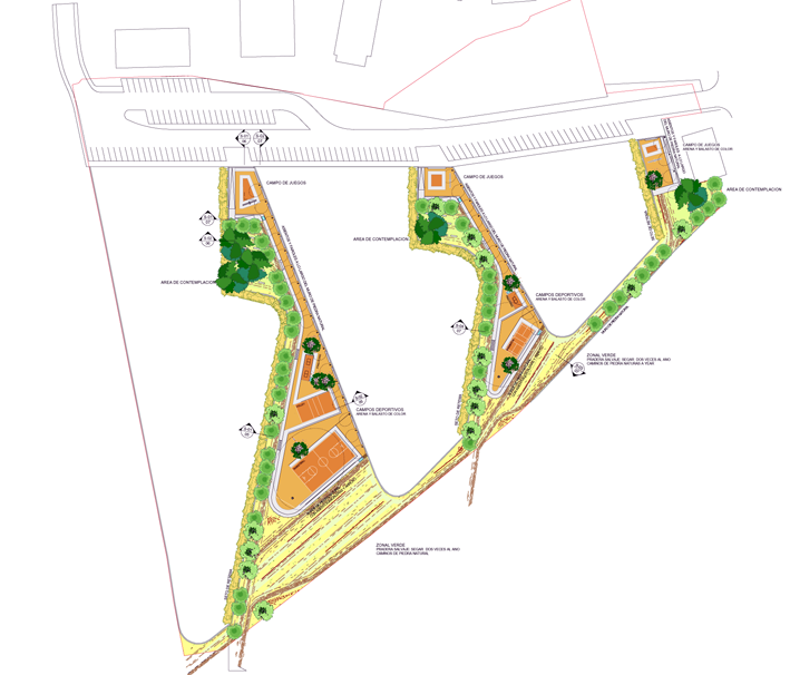 The SMAQ team was then commissioned to conduct a study for the public spaces on the Ronda Sur site. The plan for these spaces is based on the zone’s urban development scheme and helps connect the city with the landscape through the topographical profile and by means of the materials and vegetation. Different typologies, elements of the surrounding countryside, are transposed to the site: courtyard and orchard flowers and fruits on the private plots, the red sand and rock of the natural landscape on the sports fields, and the tall grasses of cultivated land in the “glove-finger park”. Rows of willows line the pedestrian pathways creating a natural unity with the adjacent agrarian environment.