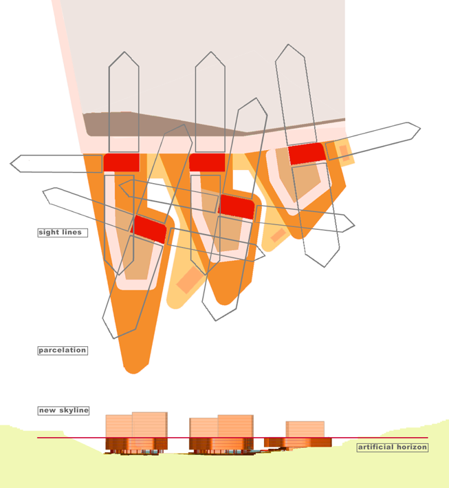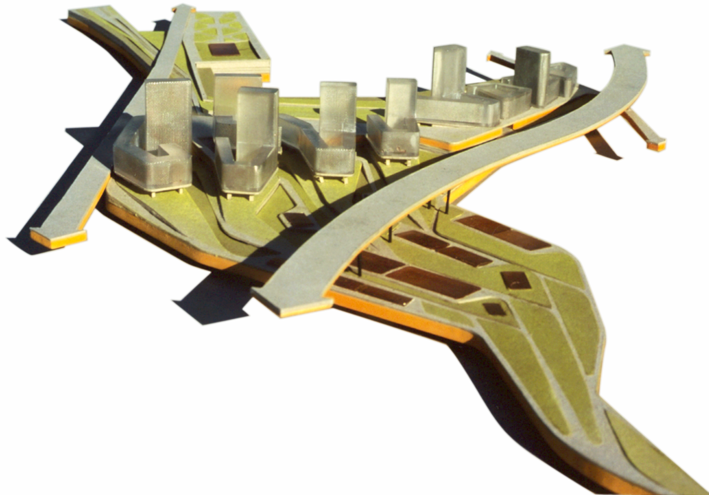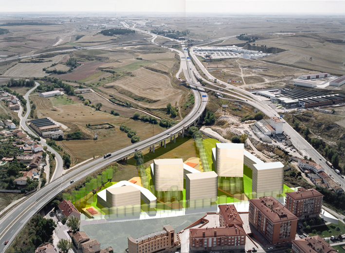 After an intermediate scheme comprising four buildings, the number of constructions was reduced to three. The plan designates the southern edge of the city of Burgos as a permeable boundary. This zone, with an area of some 3.5 hectares, would accommodate 245 apartments, 1500 square metres of retail space, 748 parking spaces and public spaces. The division between private and public plots reflects the ornamental model of the pre-existing agrarian landscape at the edge of the city, as well as the zone’s topographical profile. This creates a “finger-shaped park”. The project allows smooth access to the countryside via the urban public spaces. The volumetric distribution of the buildings adopts the competition’s loop typology, with the housing units in the form of raised patios creating a connection with the landscape. They create an artificial landscape within the topography of the valley. These towers preserve the view from the apartments, while at the same time establishing the city’s image when entering Burgos from the south.