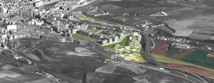 The city of Burgos was attracted by the winning project, which transforms a wasteland into an attractive urban housing district at the city entrance. However, the city was not the owner of the land. After the competition, a private developer – Aragon, Izquierdo S.L. – acquired the land, unaware of the competition. In response to the city’s strong interest in the Europan project, in October 2001 the developer commissioned the SMAQ team to produce the urban development plan for just part of the Ronda Sur site, in collaboration with a local architect. The financial constraints imposed by the developer were tight and the architects’ team was asked to adapt its project to them: 30% of the space was allocated to public spaces and roads. The remaining private spaces were to be exploited to a maximum. The underground car park was shifted above ground and the buildings made taller to increase the district’s profitability and density.