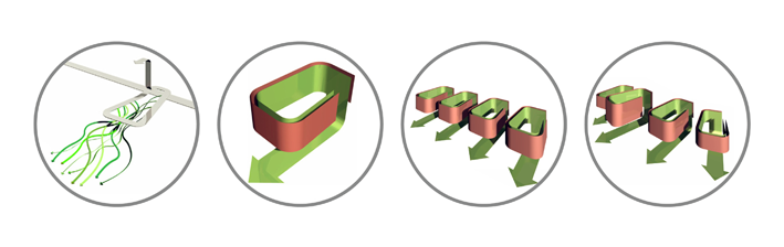 DotsAndLoops, therefore, is a diagram designed to negotiate the site-inherent potential of proximity to the countryside with its site-specific disadvantage of noise pollution caused by the nearby highway. Patio-like housing-loops screen off the sound while inviting the landscape to continue and condense within their well-tempered interior gardens.