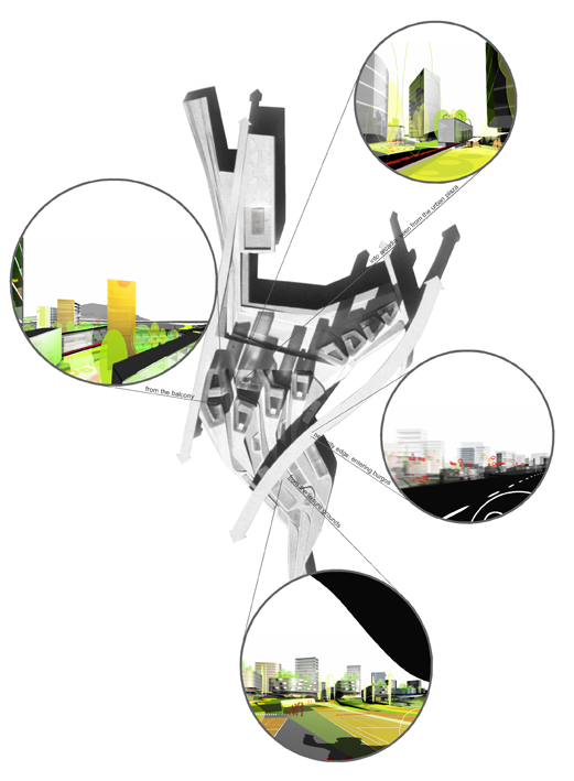 DotsAndLoops is a high-density living environment that ensures low-density qualities such a car accessibility with guaranteed parking and private connectivity to the green surroundings. It integrates a collective binding to the traffic system with a web of individual pathways leading outdoors.