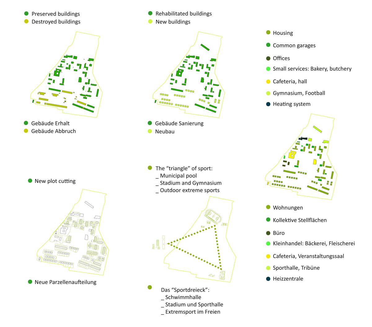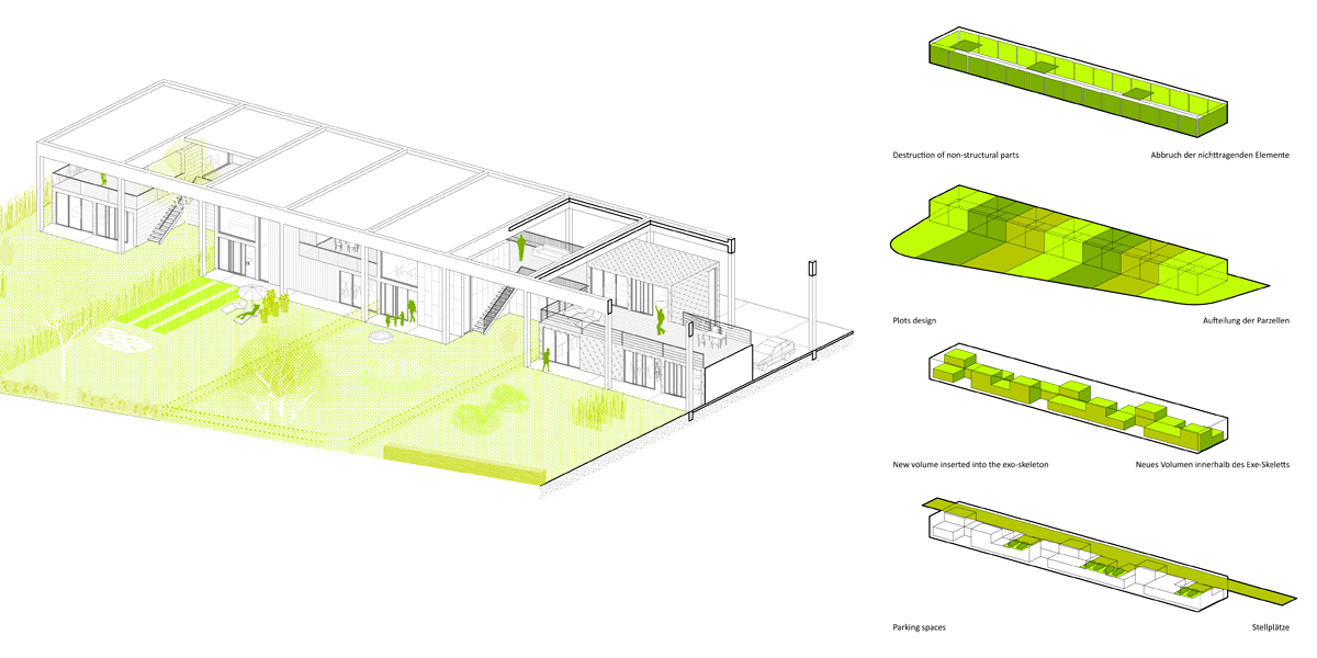 The analysis shows three prevalent existing building typologies. The approach is to convert each of them into a new residential unit: the former dormitories are rehabilitated to become townhouses, concrete garages retain their structure and become covered villages and metal garages are demolished to give way to villas on stilts.