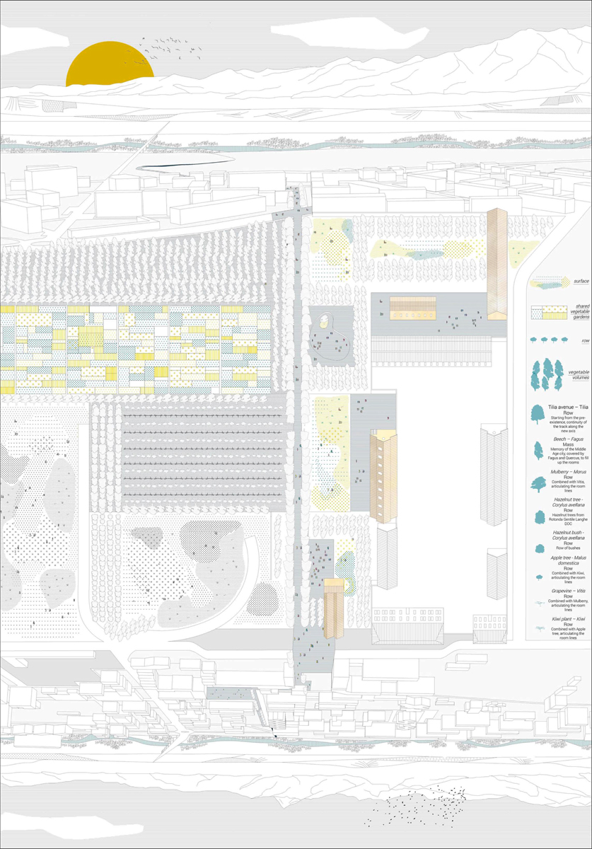 The project respects the new contemporary sense of living the city as a “common good”. In that way, spaces, paths and buildings, starting from a very simple basic organization and based on “rooms”, are functionalized and inhabited by the citizens spontaneously but also guided by specific initiatives (adopting a “room”, a carrot city, an artisan’s lab, an open library, etc…). It is distinguished by the activation of a “slow path” that also connects the city transversely by offering an interesting contribution to the future process of realization on the area.