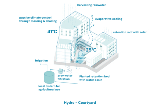 "In our approach, the focus is on systemic relationships and correlations between conceptual key points. We also aim to learn from climate zones that are likely to become comparable to Lisbon and Southern Europe, which is why we drew inspiration from morrocan architectural and urban features."