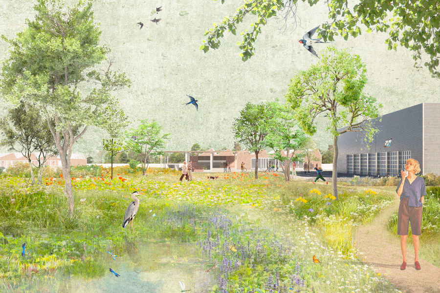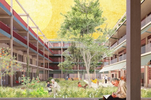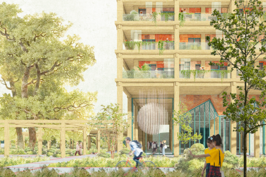"Our project focuses on the social aspect of re-sourcing, exploring how the built environment can shape lifestyles that naturally embrace circularity. By showcasing reuse, sustainable building practices, and local heritage, and by creating high-quality public spaces, we foster community care, sharing, reduced resource use, and a resilient, sustainable neighbourhood."