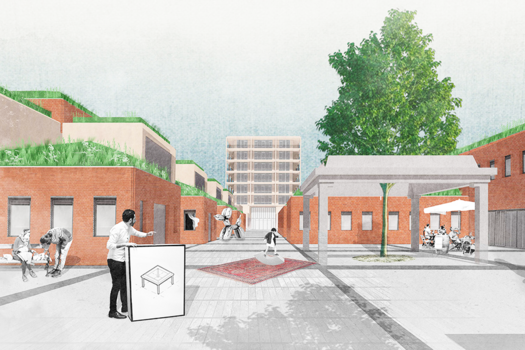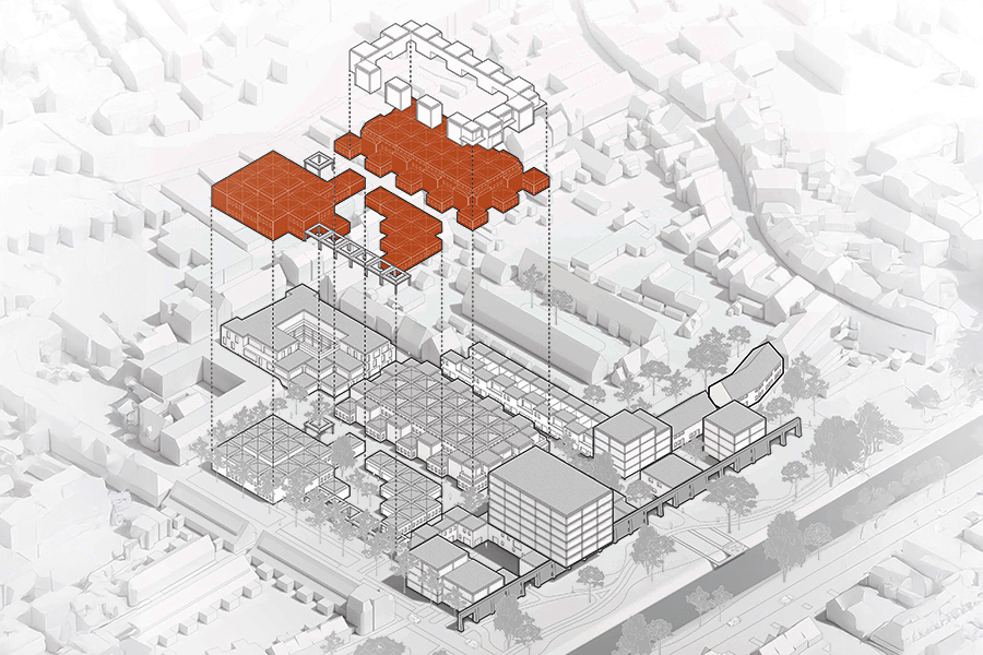 "The project is regenerative because it builds on the principles of re-value, re-use and re-connect. By opening up the introverted 1970s complex, it transforms leftover space into climate-adaptive public areas and re-establishes connections with the historic city and the green belt. Greiner’s grid becomes a flexible framework in which new social programmes, workspaces and diverse housing types can be inserted, creating a mixed environment that encourages meeting, making and collaboration."