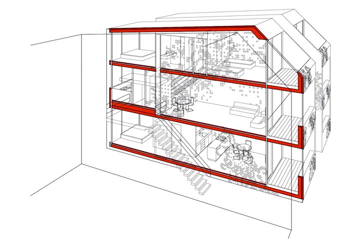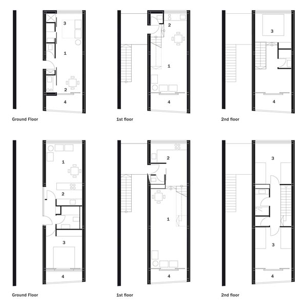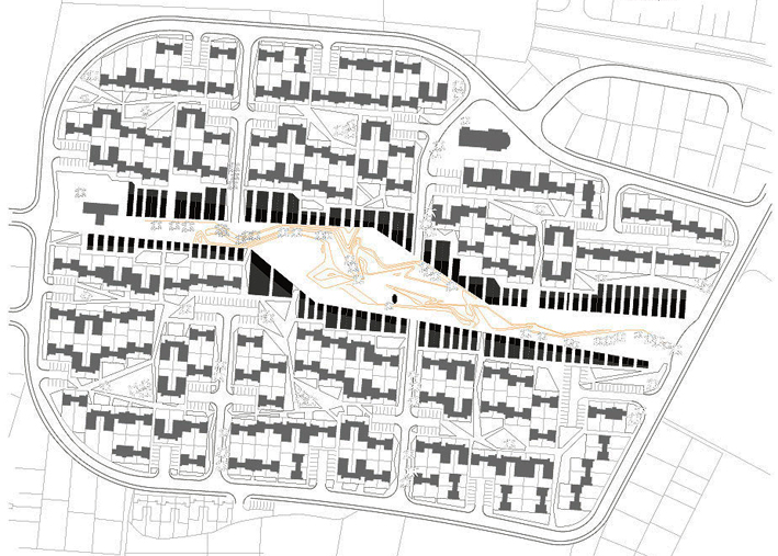 Une place paysagère linéaire est délimitée par deux solides rangées d’immeubles et le principe de maisons mitoyennes dotées de cloisons de différentes épaisseurs est appliqué.